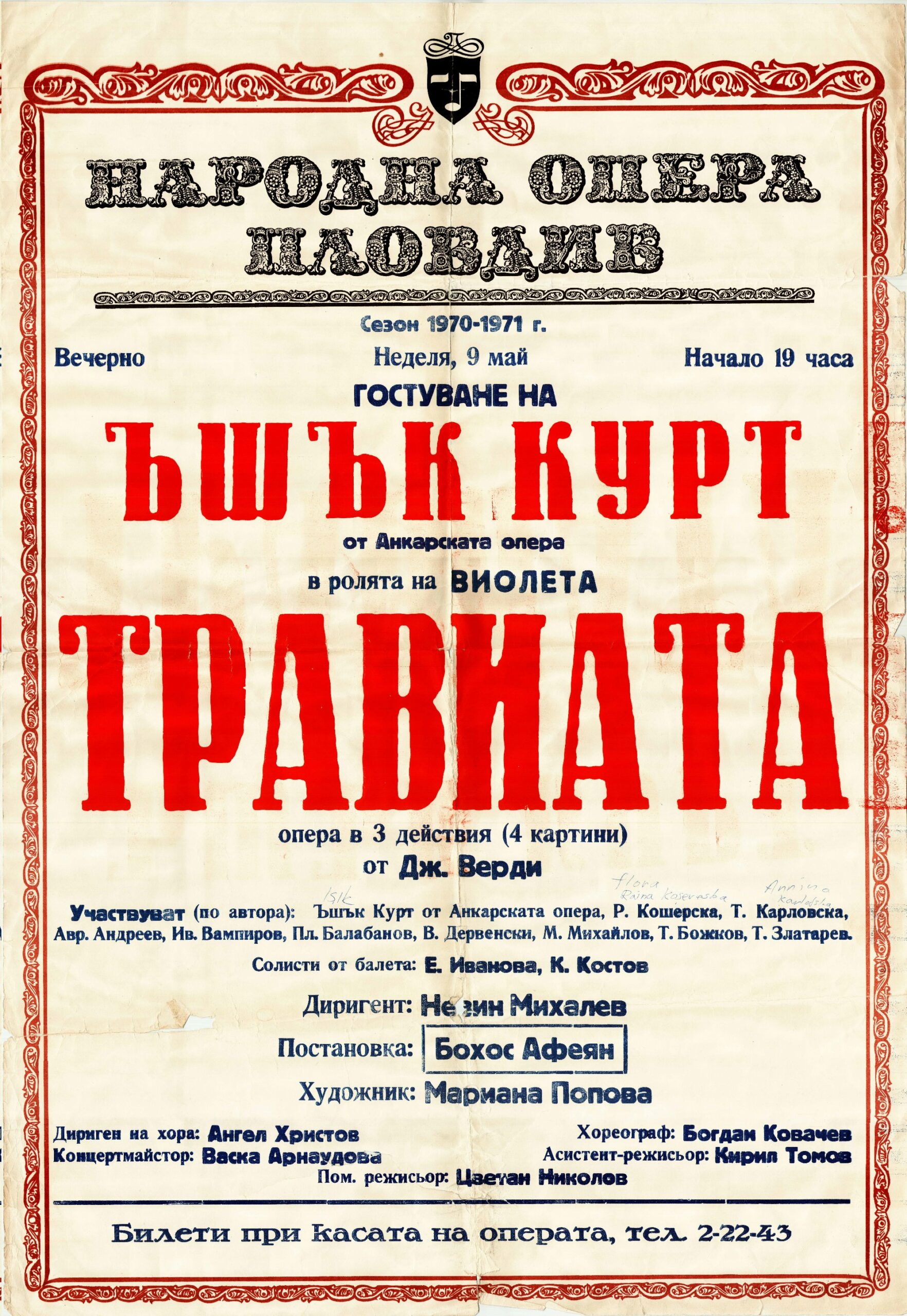 - İstanbul Kültür Sarayında Aydın Gün’ün sahneye koyduğu La Traviata operasını eşi İsmet Kurt ile oynadı.